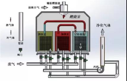 RTO把有機(jī)廢氣加熱到760攝氏度以上,使廢氣中的VOCs在氧化分解成二氧化碳和水。氧化產(chǎn)生的高溫氣體流經(jīng)特制的陶瓷蓄熱體,使陶瓷體升溫而“蓄熱”,此“蓄熱”用于預(yù)熱后續(xù)進(jìn)入的有機(jī)廢氣,從而節(jié)省廢氣升溫的燃料消耗。陶瓷蓄熱體應(yīng)分成三個(gè)(含三個(gè))以上的區(qū)或室,每個(gè)蓄熱室依次經(jīng)歷蓄熱-放熱-清掃等程序,周而復(fù)始,連續(xù)工作。蓄熱室“放熱”后應(yīng)立即引入部分已處理合格的潔凈排氣對(duì)該蓄熱室進(jìn)行清掃(以保證VOC去除率在99%以上),只有待清掃完成后才能進(jìn)入“蓄熱”程序。RTO蓄熱式廢氣處理設(shè)備,運(yùn)行費(fèi)用省,有機(jī)廢氣的處理效率高的優(yōu)點(diǎn),適應(yīng)廢氣濃度1000~10000mg/m3,分解效率:99%—99.5%。是目前較為經(jīng)濟(jì)可靠的達(dá)到50mg/m3嚴(yán)格的排放標(biāo)準(zhǔn)的VOCs治理技術(shù),得到了廣泛的應(yīng)用。