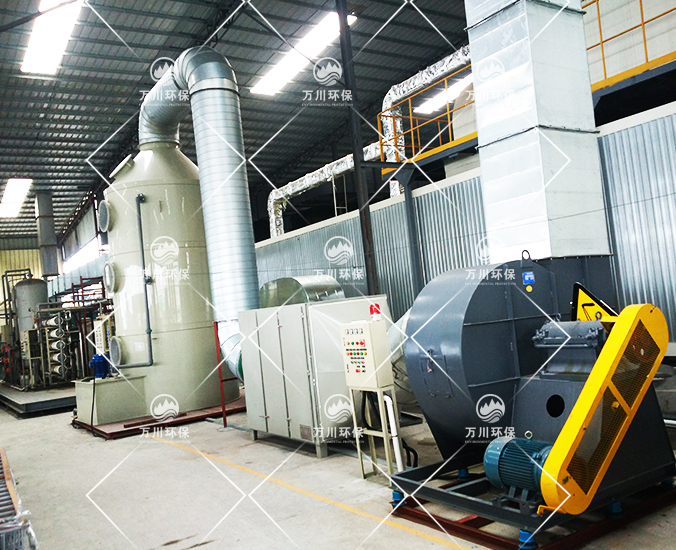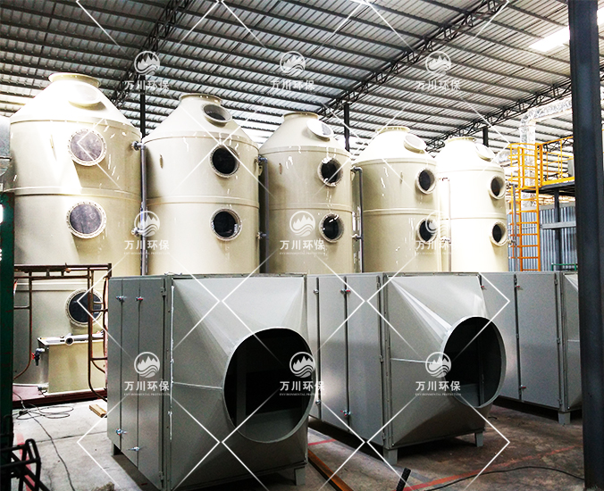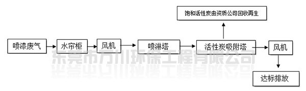 根據(jù)廠方提供的資料及現(xiàn)場(chǎng)勘察的情況。其噴漆廢氣的來(lái)源主要為無(wú)塵噴漆車(chē)間內(nèi)的5條自動(dòng)噴涂線。在生產(chǎn)過(guò)程中有噴漆,該工序產(chǎn)生了一定量含三苯有機(jī)廢氣和噴漆粉塵,該廢氣不僅對(duì)環(huán)境造成污染,而且對(duì)人體有較大的危害作用,同時(shí)也破壞了周邊的環(huán)境,造成了不良的影響,需進(jìn)行處理后排放。我們工程師分析了該廢氣的特點(diǎn)和以往的案例經(jīng)驗(yàn),采用了“水簾柜+噴淋塔+活性炭吸附塔”這套解決方案。