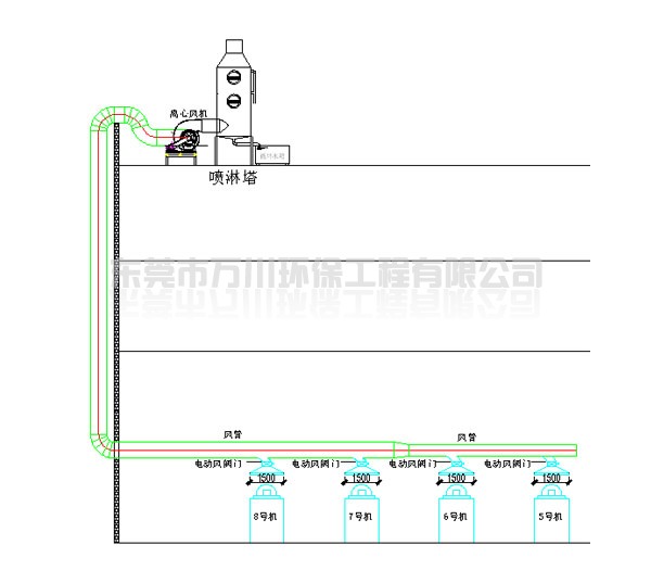 根據(jù)廠方提供的資料及現(xiàn)場勘察的情況,我司可以確定該廠的廢氣為“氨氣”。根據(jù)該廢氣的性質(zhì),萬川環(huán)保決定為該廠選定設(shè)備為--噴淋塔。(工藝簡圖如下)